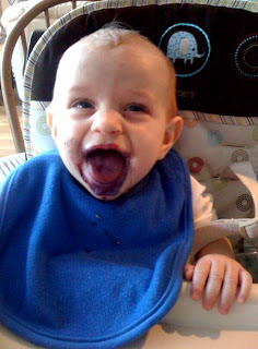 I have been making Field's food with the Beaba Babycook. He eats oatmeal with fruit for breakfast and rice with veggies for dinner. Lunch depends on his mood, where we are and what I have available. I started giving him oatmeal when he was 4 months old hoping it would help him sleep better / longer (it didn't) and so that he could practice before it became a nutritional necessity. It worked out well because he is a great eater now that he definitely needs it. The pic with the blueberries is really the most mess he has ever made. In fact, I was brave enough to feed him in the car, in his church clothes on the way to church this past Sunday and it worked out beautifully.
